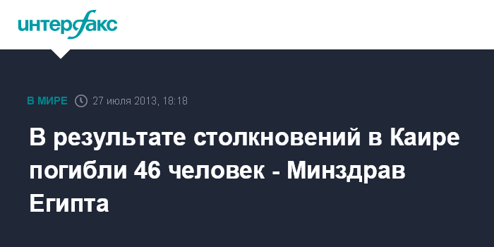Каир. 27 июля. INTERFAX.RU - Министерство здравоохранения Египта сообщило в субботу, что жертвами столкновений полиции с оппозиционерами в Каире стали 46 человек, еще 708 получили ранения и травмы.