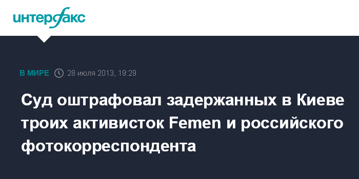 Москва/Киев. 28 июля. ИНТЕРФАКС - Оболонский райсуд в Киеве назначил штрафы российскому фотокорреспонденту Дмитрию Костюкову и трем активисткам движения Femen, задержанным накануне в украинской столице, сообщил "Интерфаксу" в воскресенье адвокат Ярослав Яценко, присутствовавший на судебном заседании.