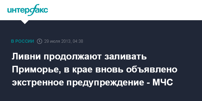Владивосток. 29 июля. ИНТЕРФАКС - ДАЛЬНИЙ ВОСТОК - Экстренное предупреждение в связи с дождевым прогнозом вновь объявлено в понедельник в Приморье, где в течение июля выпало уже около двух месячных норм осадков.