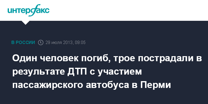 Пермь. 29 июля. INTERFAX.RU - В ДТП в Перми с участием пассажирского автобуса и легкового автомобиля погиб пассажир, еще трое ранены, сообщает ГУ МВД по Пермскому краю в понедельник.