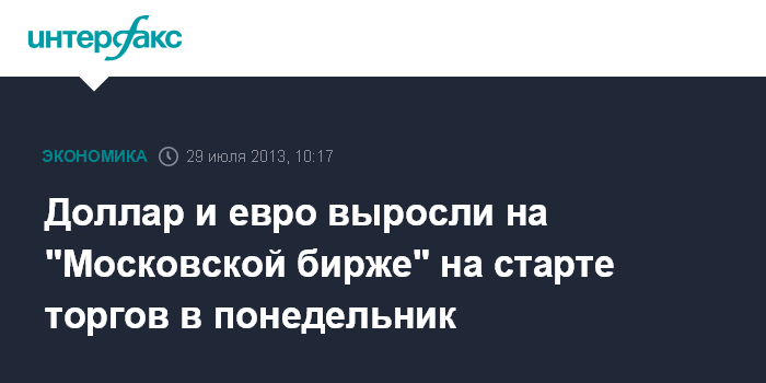 Москва. 29 июля. INTERFAX.RU - Доллар и евро выросли на "Московской бирже" при открытии торгов в понедельник, рубль ослаб по отношению к бивалютной корзине в преддверии аукциона РЕПО под нерыночные активы.
