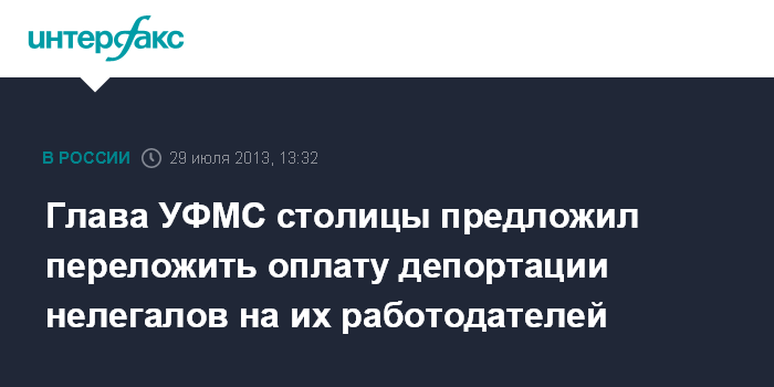 Москва. 29 июля. INTERFAX.RU - Начальник УФМС РФ по Москве Ольга Кириллова считает, что предварительный взнос на покрытие расходов, связанных с возможной депортацией, за трудовых мигрантов должны вносить работодатели.