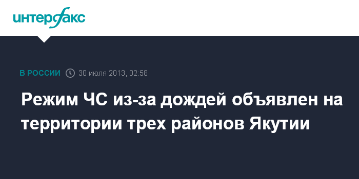 Якутск. 30 июля. ИНТЕРФАКС - ДАЛЬНИЙ ВОСТОК - Глава Якутии Егор Борисов подписал указ об объявлении режима чрезвычайной ситуации на территориях Верхоянского, Момского, Оймяконского районов республики в связи с повышением уровня воды на реках.