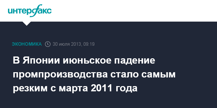 30 июля. FINMARKET.RU - В июне 2013 года объем промышленного производства в Японии упал на 3,3% по сравнению с предыдущим месяцем, что стало худшим результатом с марта 2011 года, когда страна пострадала от разрушительного землетрясения, сообщило сегодня министерство экономики, торговли и промышленности.