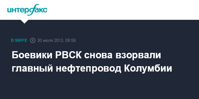 Богота. 30 июля. INTERFAX.RU - Боевики левацкой повстанческой группировки Революционные вооруженные силы Колумбии (РВСК) в очередной раз подорвали основной в стране нефтепровод "Каньо Лимон", который расположен в департаменте Араука, сообщает во вторник колумбийское радио.