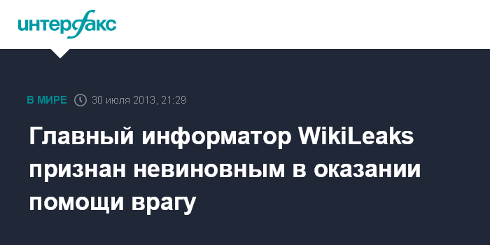 Вашингтон. 30 июля. INTERFAX.RU - Военный трибунал США признал информатора сайта Wikileaks Брэдли Мэннинга невиновным в оказании помощи врагу, сообщает во вторник АП.