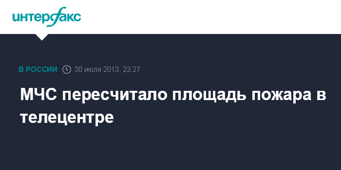 Москва. 30 июля. INTERFAX.RU - Площадь пожара в телевизионном техническом центре "Останкино", по уточненным данным, составила 25 квадратных метров, сообщили "Интерфаксу" в пресс-службе ГУ МЧС России по Москве. "По уточненным данным, площадь возгорания в телецентре составила 25 метров", - сказал сотрудник пресс-службы.