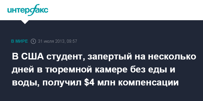 Лондон. 31 июля. INTERFAX.RU - Власти США выплатили более $4 млн Дэниэлу Чуну, студенту из американского города Сан-Диего, в качестве компенсации после того, как он провел больше четырех дней в тюремной камере без надзора, пищи и воды, сообщает в среду BBC.