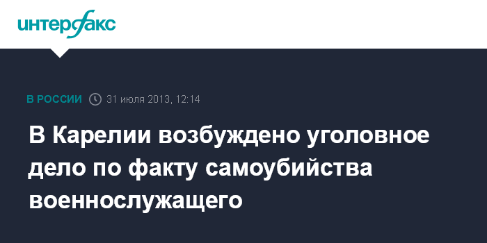 Петрозаводск. 31 июля. INTERFAX.RU - В Карелии возбуждено уголовное дело по факту самоубийства военнослужащего в воинской части в местечке Бесовец под Петрозаводском, сообщил "Интерфаксу" источник в правоохранительных органах республики.