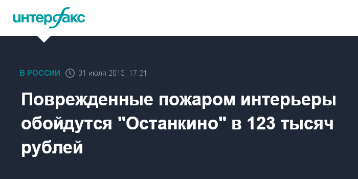 Москва. 31 июля. INTERFAX.RU - Восстановление пострадавших в результате пожара в "Останкино" интерьеров помещений обойдется в 123 тыс. рублей.