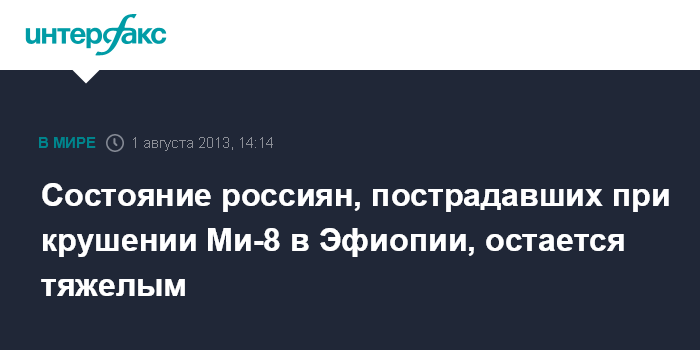"Пилоты потерпевшего аварию вертолета Ми-8 находятся в Российском Госпитале Красного Креста им. Балчи. Состояние одного из них врачи оценивают как среднее, трех - как тяжелое. Однако непосредственной угрозы для жизни не усматривают", - сообщили в российской дипмиссии в Эфиопии.