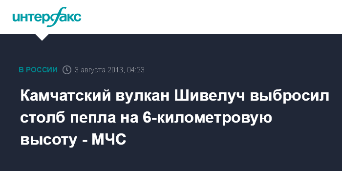 Петропавловск-Камчатский. 3 августа. ИНТЕРФАКС - ДАЛЬНИЙ ВОСТОК - Вулкан Шивелуч, извергающийся на Камчатке, выбросил столб пепла высотой 6 км над уровнем моря, сообщает ГУ МЧС по Камчатскому краю со ссылкой на данные регионального филиала Геофизической службы РАН.