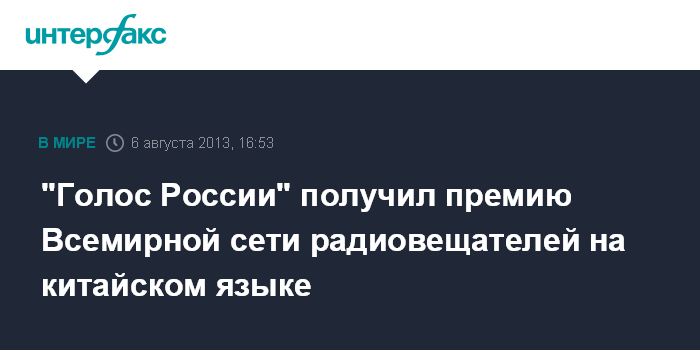 Москва. 6 августа. INTERFAX.RU - Радиокомпания "Голос России" в третий раз стала лауреатом премии Всемирной сети радиовещателей на китайском языке.