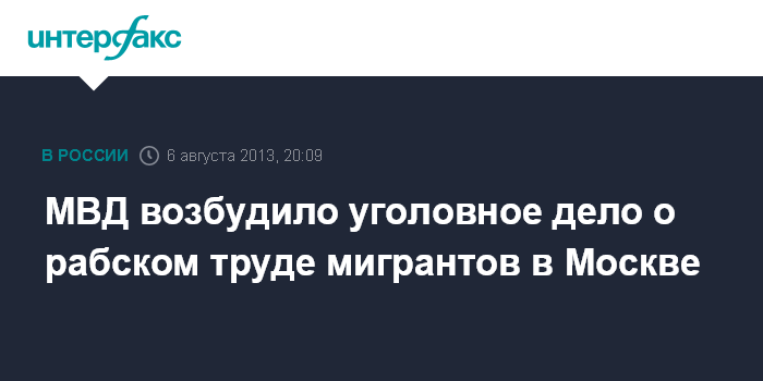 Москва. 6 августа. INTERFAX.RU - Возбуждено уголовное дело против шестерых мужчин, подозреваемых в использовании рабского труда 700 мигрантов в Москве, сообщили во вторник в пресс-службе столичного ГУ МВД России.