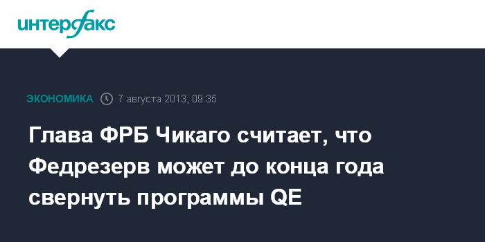 Глава чикагского ФРБ заявил, что он не может прогнозировать, на каком именно из оставшихся трех заседаний ФРС в этом году будет объявлено о таком решении. При этом он не исключает, что Федрезерв перейдет к свертыванию стимулов уже в сентябре.