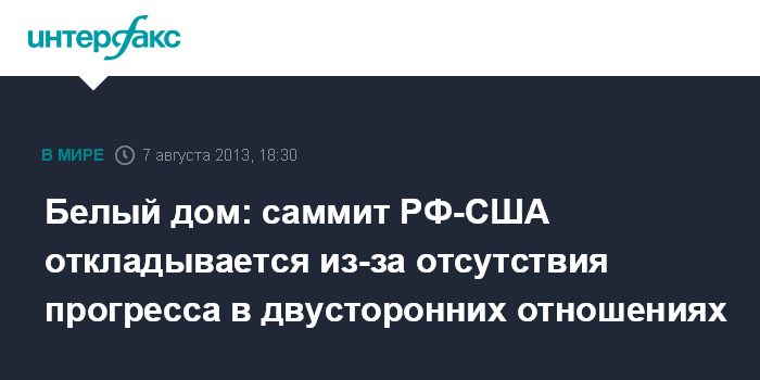 Вашингтон. 7 августа. INTERFAX.RU - Решение президента США Барака Обамы отложить сентябрьский российско-американский саммит в Москве принято из-за отсутствия прогресса в двусторонних отношениях, заявил в среду пресс-секретарь главы Белого дома Джей Карни.