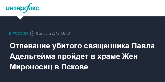 Псков. 8 августа. INTERFAX.RU - Прощание с убитым священником Павлом Адельгеймом пройдет в Пскове в четверг.