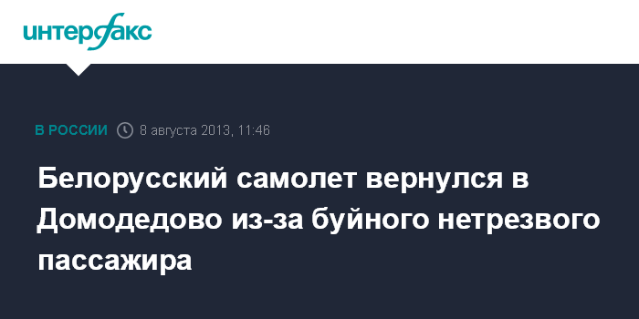 Москва. 8 августа. INTERFAX.RU - Самолет "Москва - Минск" белорусской авиакомпании вынужден был вернуться в "Домодедово", предположительно, из-за неадекватного поведения нетрезвого пассажира, сообщил "Интерфаксу" источник в авиадиспетчерских службах московского авиаузла.