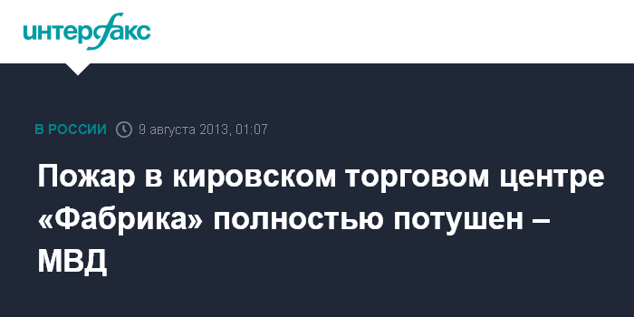 Киров. 9 августа. ИНТЕРФАКС-ПОВОЛЖЬЕ – Пожарные полностью потушили огонь в кировском торговом центре «Фабрика», сообщили агентству «Интерфакс-Поволжье» в пресс-службе УМВД по Кировской области в пятницу.
