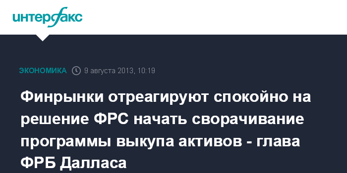 9 августа. FINMARKET.RU - Президент Федерального резервного банка (ФРБ) Далласа Ричард Фишер полагает, что финансовые рынки, вероятно, спокойно отреагируют на решение Федеральной резервной системы (ФРС) начать сворачивание программы выкупа активов, когда оно будет принято.