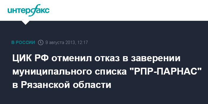 Москва. 9 августа. INTERFAX.RU - ЦИК России согласился с жалобой регионального отделения партии "РПР-ПАРНАС" в Рязанской области на отказ областного избиркома в заверении муниципального списка кандидатов в депутаты Рязанской городской думы.