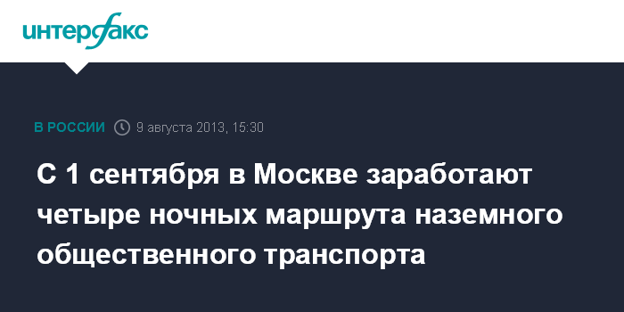 Москва. 9 августа. INTERFAX.RU - С 1 сентября в столице планируется запустить четыре ночных маршрута наземного городского пассажирского транспорта. "Мы предлагаем ввести с 1 сентября четыре ночных маршрута, из которых три являются продолжением существующих дневных маршрутов", - сообщил и.о. заммэра по вопросам транспорта Максим Ликсутов.