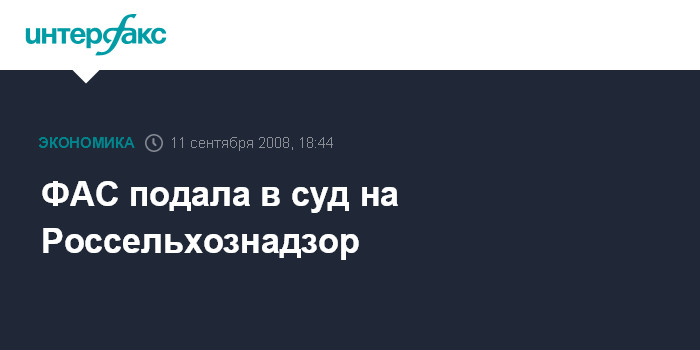 Москва. 11 сентября. INTERFAX.RU - Федеральная антимонопольная служба (ФАС) РФ подала иск в Арбитражный суд Москвы о понуждении Россельхознадзора к исполнению предписания ФАС, касающегося устранения нарушения на рынке обеззараживания подкарантинной продукции, говорится в сообщении ФАС.