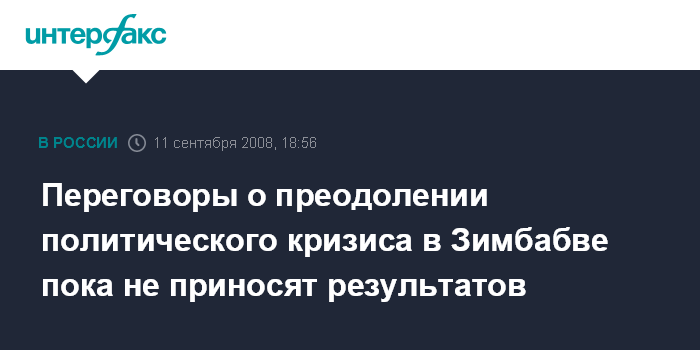 Москва. 11 сентября. INTERFAX.RU - Президент Зимбабве Роберт Мугабе заявил, что его переговоры с оппозицией о преодолении политического кризиса пока не приносят результатов.