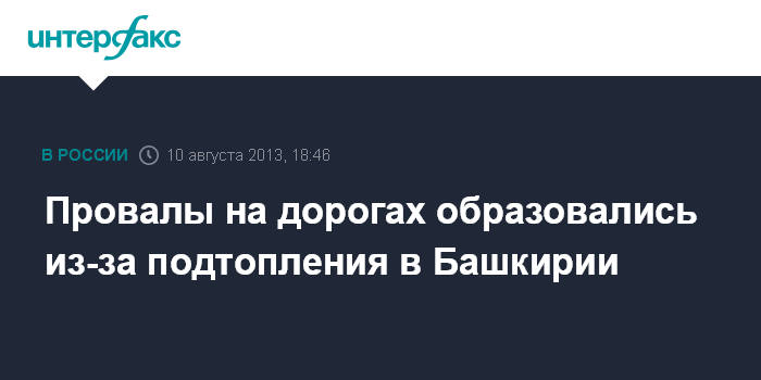 Уфа. 10 августа. INTERFAX.RU - Провалы проезжей части образовались в Абзелиловском районе Башкирии из-за подтопления, сообщает пресс-служба республиканского управления ГИБДД МВД в субботу. На пострадавших от стихии участках автодорог установлены временные дополнительные дорожные знаки. При этом ограничен проезд по автодорогам Аскарово - Аэропорт, Давлетово - Альмухаметово, Аскарово - Халилово.