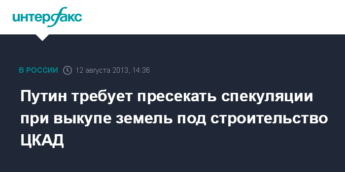 Одинцово. 12 августа. INTERFAX.RU- Президент РФ Владимир Путин предупредил, что все попытки нажиться на выкупе земельных участков под строительство Центральной кольцевой автодороги (ЦКАД) будут жестко пресекаться.