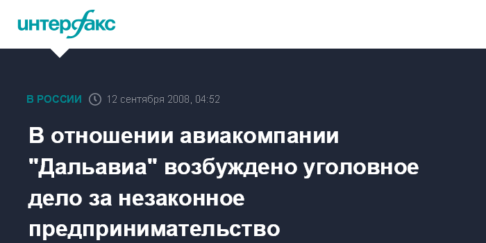 Хабаровск. 12 сентября. ИНТЕРФАКС-ДАЛЬНИЙ ВОСТОК - Следственные органы возбудили уголовное дело в отношении хабаровской авиакомпании "Дальавиа" по статье 171 УК РФ ("незаконное предпринимательство").