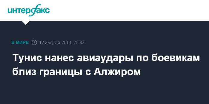 Тунис. 12 августа. INTERFAX.RU - Самолеты ВВС Туниса в понедельник нанесли удары по позициям бойцов радикальных исламистских группировок недалеко от границы с Алжиром, заявили в тунисском военном командовании.