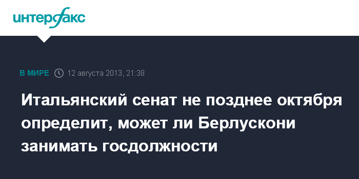 Рим. 12 августа. INTERFAX.RU - Сенат Италии проведет голосование по вопросу отстранения экс-премьера страны Сильвио Берлускони от занятия постов в государственных учреждениях не позднее октября текущего года, заявил в понедельник глава сенатского комитета по вопросам выборов Дарио Стефано.