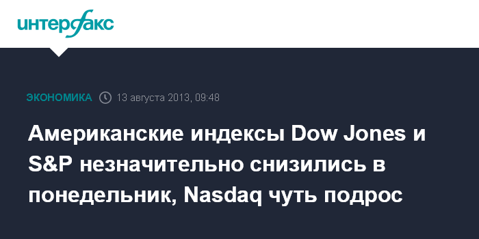 13 августа. FINMARKET.RU - По итогам торгов в понедельник американские фондовые индексы Dow Jones Industrial Average и Standard & Poor's 500 потеряли несколько пунктов на негативных новостях об экономике Японии, а также в ожидании публикации данных об объеме розничных продаж в США, сообщил Bloomberg. В то же время Nasdaq Composite незначительно вырос, в основном благодаря повышению котировок акций Apple, занимающей значительную долю в этом индексе. При этом активность торговли была невысокой, отмечает издание MarketWatch.