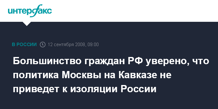 Большинство россиян (59%) уверены, что политика руководства России в связи с ситуацией на Кавказе не приведет к изоляции страны, и напряженность в отношениях Москвы с Западом вскоре спадет.