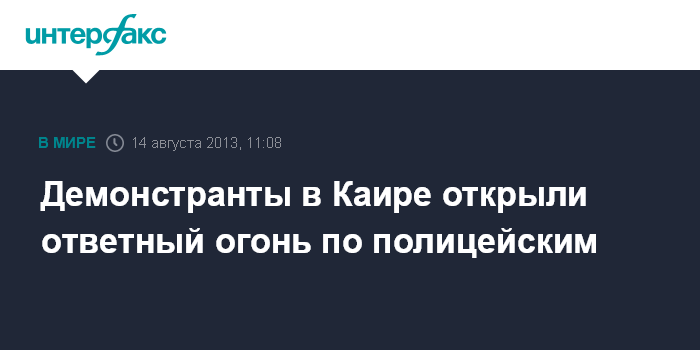 Дубай. 14 августа. INTERFAX.RU - Участники акции протеста на площади Рабиа аль-Адавия в Каире открыли огнестрельный огонь по стражам правопорядка, передает в среду межарабский телеканал "Аль-Джазира".