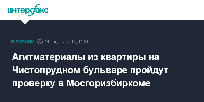 Москва. 14 августа. INTERFAX.RU - Агитационные материалы, найденные накануне в квартире на Чистопрудном бульваре, будут переданы для проверки в Мосгоризбирком, сообщили "Интерфаксу" в пресс-службе ГУ МВД по Москве.
