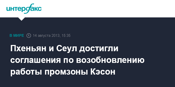 Сеул. 14 августа. INTERFAX.RU - Делегации из Южной и Северной Кореи достигли соглашения по возобновлению работы совместной промзоны Кэсон на переговорах в среду, говорится в совместном заявлении делегаций Сеула и Пхеньяна.