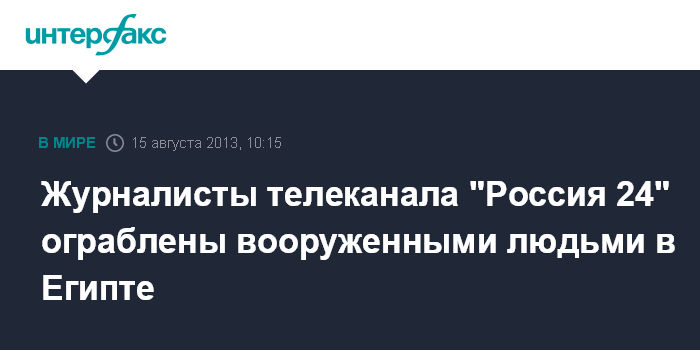 Москва. 15 августа. INTERFAX.RU - Съемочная группа телеканала "Россия 24" подверглась разбойному нападению вооруженных людей в Египте, сообщает сайт телеканала в четверг.