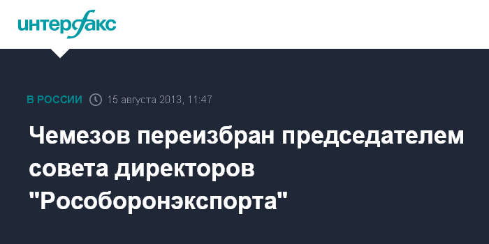 Москва. 15 августа. INTERFAX.RU - Генеральный директор госкорпорации "Ростех" Сергей Чемезов в третий раз избран председателем совета директоров "Рособоронэкспорта", сообщает пресс-служба госкорпорации.