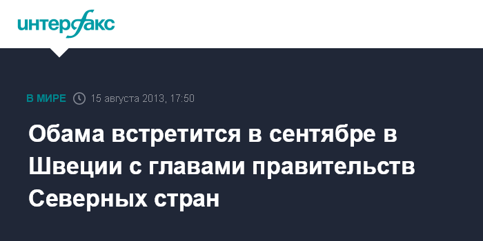 Стокгольм. 15 августа. INTERFAX.RU - Президент США Барак Обама в сентябре проведет в шведской столице Стокгольме встречу с руководителями правительств Северных стран, заявил в четверг премьер-министр Швеции Йон Фредрик Райнфельдт.
