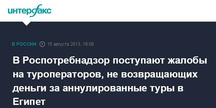 Москва. 15 августа. INTERFAX.RU - В Роспотребнадзоре обвинили в безответственности туроператоров, которые отказываются возвращать деньги россиянам, не желающим лететь в Египет из-за обострения ситуации в этой стране.