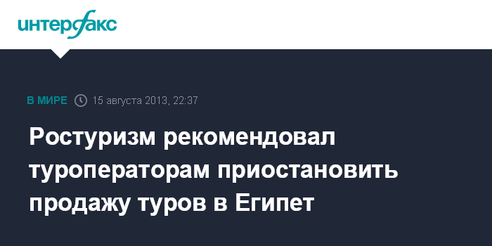 Москва. 15 августа. INTERFAX.RU - Федеральное агентство по туризму рекомендовало российским туроператорам и турагентам приостановить реализацию туров в Египет до нормализации обстановки в стране.