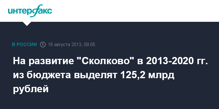 Москва. 16 августа. INTERFAX.RU - На создание и развитие иннограда "Сколково" в 2013-2020 годах из федерального бюджета должно быть выделено 125,2 млрд рублей, следует из распоряжения правительства РФ, подписанного премьер-министром Дмитрием Медведевым.