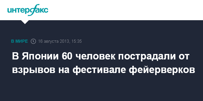 Токио. 16 августа. INTERFAX.RU - Не меньше 60 человек получили ранения в японской префектуре Киото на острове Хонсю после того, как на смотровой площадке, подготовленной для наблюдения за фестивалем фейерверков, произошло несколько взрывов, сообщает в пятницу японский телеканал NHK.