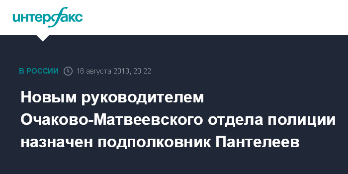 Москва. 16 августа. INTERFAX.RU - Глава столичного МВД Анатолий Якунин назначил нового руководителя московского отдела полиции Очаково-Матвеевское, им стал подполковник Юрий Пантелеев, сообщает ГУ МВД по Москве.
