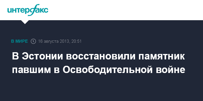 Таллин. 16 августа. ИНТЕРФАКС - В Эстонии в городе Валга на границе с Латвией в пятницу состоялась торжественная церемония открытия восстановленного памятника погибшим в Освободительной войне 1918-1920 годов.