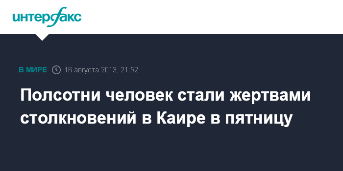 Лондон/Дубай. 16 августа. INTERFAX.RU - По меньшей мере, 50 человек были убиты в пятницу в результате столкновений между сторонниками и противниками экс-президента Египта Мухаммеда Мурси в столице Каире, сообщил сайт газеты The Guardian.