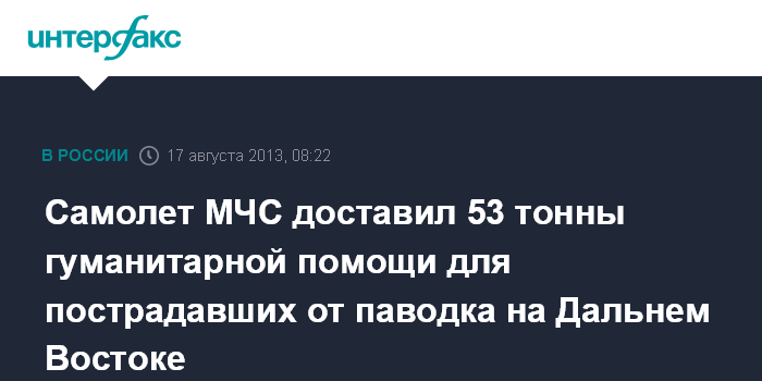 "На борту находятся 53 тонны груза гуманитарной помощи (консервы, крупа рисовая, сахар, 1000 спасательных жилетов, 20 моторных лодок, 20 надувных лодок) пострадавшему населению ДФО", - сообщается на сайте МЧС РФ.