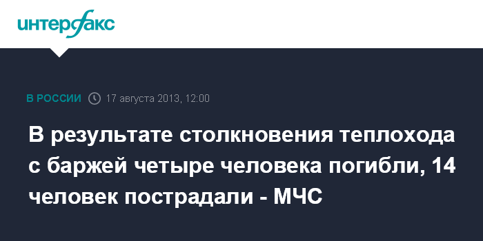 Москва. 17 августа. INTERFAX.RU - Столкновение пассажирского теплохода с грузовой баржей на Иртыше в Омской области привело к жертвам. "В результате столкновения 14 человек пострадали, 4 человека погибли. Информация уточняется", - сообщает сайт ГУ МЧС по Омской области.